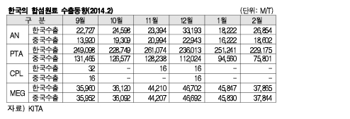 표, 그래프: < 한국의 합섬원료 수출동향(2014.2) > <화학저널 2014/03/25> |