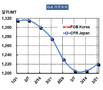 O-X 가격은 3월21일 FOB Korea 톤당 1220달러로 15달러 상승했다.