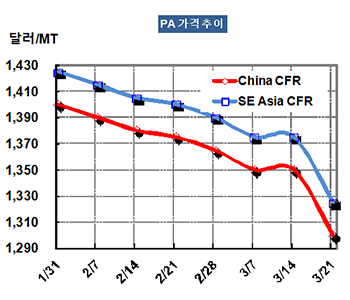 PA 가격은 3월20일 CFR China 톤당 1300달러로 50달러 폭락했다.