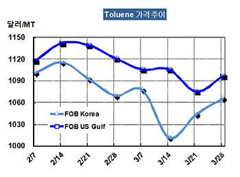 톨루엔 가격은 3월28일 FOB Korea 톤당 1066달러로 22달러 상승했다.