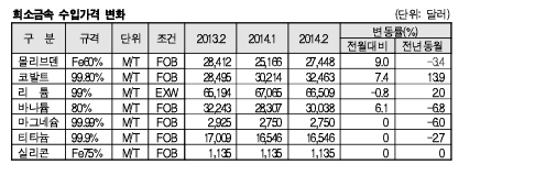 2014년 2월 희소금속 수입가격은 수요 증가로 상승세를 이어가고 있다.