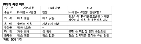 염소는 환경에 유해하고 전자제품의 오작동을 유발하는 것으로 알려져 SK케미칼의 기술력은 다른 경쟁기업과 차별적인 것으로 평가되고 있다.