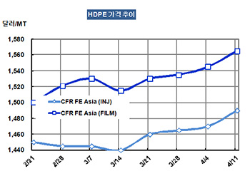 HDPE 가격은 4월9일 CFR FE Asia 톤당 1490달러로 20달러 급등했다.