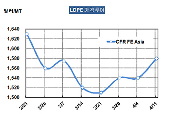 LDPE 가격은 4월9일 CFR FE Asia 톤당 1580달러로 40달러 폭등했다.