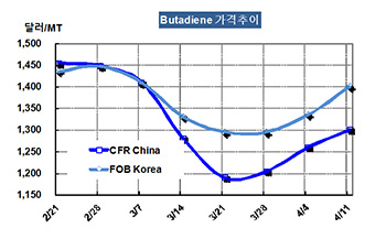 부타디엔 가격은 4월11일 FOB Korea 톤당 1400달러로 65달러 급등했다.