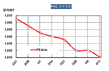 PVC 가격은 4월9일 CFR China 1010달러로 10달러 하락했다.