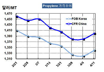 프로필렌 가격은 4월11일 FOB Korea 톤당 1340달러로 20달러 상승했다.