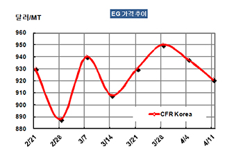 MEG 가격은 4월11일 CFR China 톤당 921달러로 17달러 하락했다.