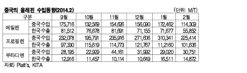 표, 그래프: < 중국의 올레핀 수입동향(2014.2) > <화학저널 2014/04/15> |