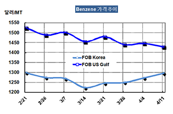 벤젠 가격은 4월11일 FOB Korea 톤당 1296달러로 25달러 상승했다.