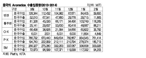 표, 그래프: < 중국의 Aromatics 수출입동향(2013-2014) <화학저널 2014/04/16> |