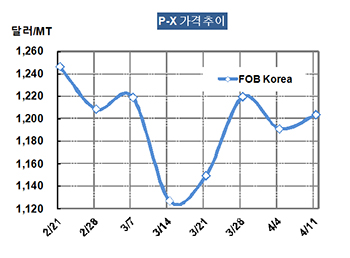 P-X 가격은 4월11일 FOB Korea 톤당 1204달러로 13달러 상승했다.