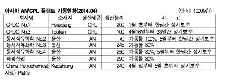 표, 그래프: < 아시아 AN/CPL 플랜트 가동현황(2014.04) > <화학저널 2014/04/17> |