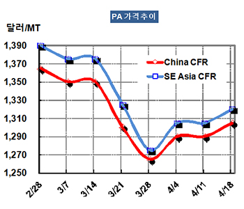 PA 가격은 4월17일 CFR China 톤당 1305달러로 15달러 상승했다.