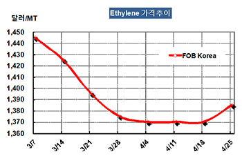 에틸렌 가격은 4월25일 FOB Korea 톤당 1385달러로 15달러 상승했다.