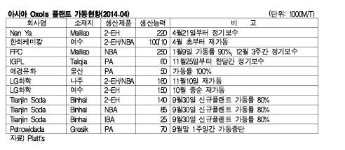 표, 그래프: <아시아 Oxols 플랜트 가동현황(2014.04)> <화학저널 2014/04/30> |