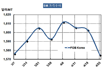 SM 가격은 4월25일 FOB Korea 톤당 1575달러로 28달러 급락했다.