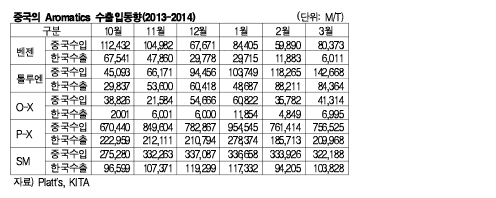 표, 그래프: <중국의 Aromatics 수출입동향(2013-2014)> <화학저널 2014/04/30> |