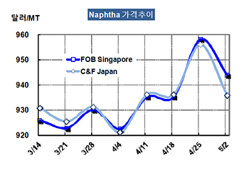나프타 가격은 5월2일 CFR Japan 톤당 936달러로 20달러 하락했다.