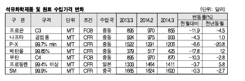 표, 그래프: <석유화학제품 및 원료 수입가격 변화> <화학저널 2014/05/07> |