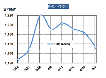 P-X 가격은 5월2일 FOB Korea 톤당 1154달러로 29달러 급락했다.