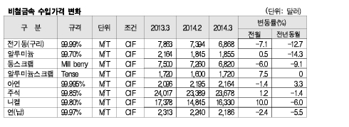 표, 그래프: <비철금속 수입가격 변화> <화학저널 2014/05/09> |