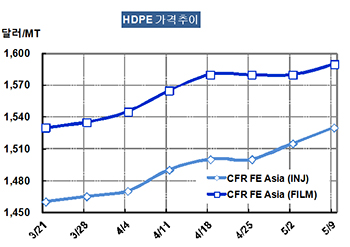 HDPE 가격은 5월7일 CFR FE Asia 톤당 1530달러로 15달러 상승했다.