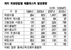 일본 플래스틱 순환이용협회는 산업계 폐플래스틱의 배출 및 처리‧처분 상황조사 결과를 발표했다. 일본은 2012년 화학, 플래스틱 등 7개 산업의 폐플래스틱 발생량이 25만7800톤으로 2007년에 비해 5만톤 감소한 것으로 나타났다. 관련기업의 감축 노력이 확대됨에 따라 자체 재사용량이 역대 최고를 기록했으며, 재사용량을 제외한 폐플래스틱 유효이용률은 95%로 1%포인트 상승했다. 폐플래스틱의 배출 및 처리‧처분 상황조사는 일본 플래스틱 순환이용협회가 산업계의 폐플래스틱을 대량 배출하는 산업, 각종 재활용법에 관련된 사업장을 대상으로 5년마다 실시하며, 2012년 실시된 4회 조사에서는 2회, 3회에 조사했던 화학, 플래스틱, 고무, 전기기기, 운송기기, 펄프‧종이‧종이가공에 철강이 포함된 7개 산업 1500개 사업장을 대상으로 실시해 유효응답률 24%를 기록했다. 2007년 3회 조사에 비해 전 분야에서 발생량이 감소해 가장 낮은 수치를 기록했다. 전체 60% 이상을 차지한 제조공정 불량품 등이 감소했으며, 포장‧운송 등은 다소 증가했다. 플래스틱제품 생산기업이 전체의 32%를 차지했으며, 열가소성 수지가 80%에 달했다. 처리처분 방법별 폐플래스틱 처리량은 고형연료‧시멘트공장이 증가했다. 특히, 고형연료는 2007년에 비해 2배 수준 늘어났다. 2010년 1월 폐기물 베이스 종이, 플래스틱 등 고형연료(RPF)가 일본공업규격(JIS)으로 지정됐기 때문이다. 단순소각, 매립은 지속적으로 감소하고 있으며 매립은 1회 조사의 1/10 이하로 하락했다. 유효이용률은 화학공업 94%, 플래스틱 96%, 전기기기 99%, 운송용 기기 99%, 펄프‧종이‧종이가공이 97%글 기록하며 7개 가운데 5개 산업이 90% 이상을 나타냈다. 열경화성수지 외에 모두가 유효이용률 90% 이상을 기록했고 범용수지와 PET(Polyethylene Terephthalate)는 재생이용이 많았고, 기타 수지는 고형연료‧시멘트공장 이용이 많았다. 4회 조사에서는 처리비용을 지불한 처리‧처분 비중이 42% 수준으로 감소한 반면 판매비중이 증가세를 나타냈다. 자가처리도 4회 연속 감소하고 있어 유효 이용할 수 있는 자가처리를 고집하지 않고 합리적인 처리방법으로 전환이 이루어진 것으로 판단된다.