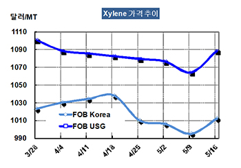 M-X 가격은 5월16일 FOB Korea 톤당 1012달러로 17달러 상승했다. 중국에서 가솔린 블렌딩용 수요가 증가함으로써 상승세로 전환됐으나 상승세를 지속할 가능성은 낮게 나타나고 있다. 표, 그래프: <Xylene 가격추이> <화학저널 2014/05/22> |