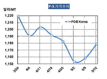 P-X 가격은 5월16일 FOB Korea 톤당 1179달러로 20달러 상승했다.