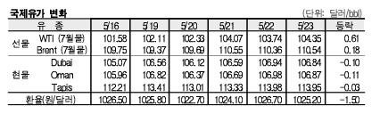 5월23일 국제유가는 우크라이나 사태 긴장감 지속 및 리비아의 공급 차질 우려 등의 영향으로 상승했다.