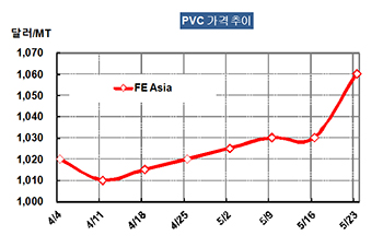 PVC 가격은 5월21일 CFR China 1120달러로 30달러 폭등했다.