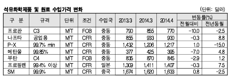 표, 그래프: <석유화학제품 및 원료 수입가격 변화> <화학저널 2014/05/27> |