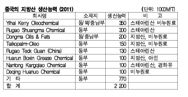 중국은 최근 들어 화학산업이 발달하고 화학제품 수요가 급격히 증가하면서 지방산 생산이 빠르게 증가하고 있다.