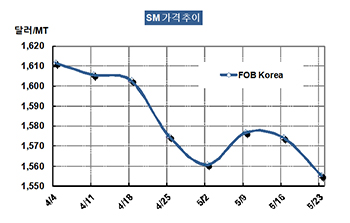 SM 가격은 5월23일 FOB Korea 톤당 1555달러로 19달러 하락했다.