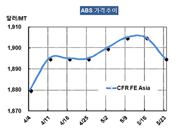 ABS 가격은 5월21일 CFR China 톤당 1895달러로 10달러 하락했다.
