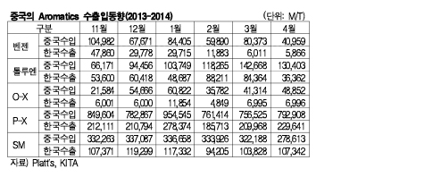벤젠 수입은 3월 8만373톤에서 4월 4만959톤으로 3만9414톤 급감했으며 한국산은 3월 6011톤, 4월 5866톤을 기록하며 2012년 7월 이후 최저 수입량을 기록했다.