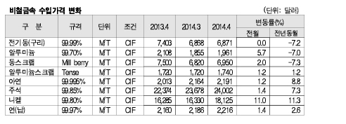 한국수입업협회(KOIMA)에 따르면, 니켈은 CIF 톤당 1만8125달러에 거래되며 2014년 3월에 비해 1795달러 폭등했다.