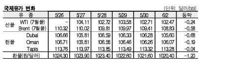 6월2일 국제유가는 OPEC의 공급 증가 및 미국의 달러화 강세 등의 영향으로 하락했다.