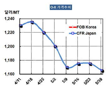O-X 가격은 5월30일 FOB Korea 톤당 1165달러로 10달러 하락했다.