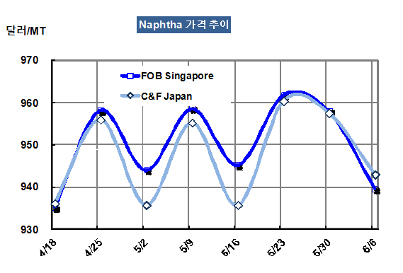 나프타 가격은 6월6일 CFR Japan 톤당 943달러로 15달러 하락했다.