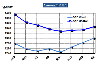 벤젠 가격은 6월6일 FOB Korea 톤당 1301달러로 18달러 상승했다.