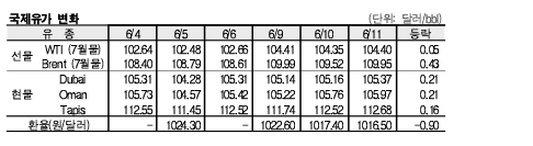 6월11일 국제유가는 이라크의 정정 불안 및 미국의 원유 재고 감소 등으로 상승했다.