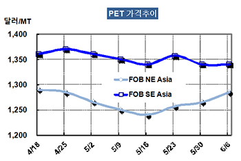 PET 가격은 6월4일 Bottle 그레이드 기준 FOB NE Asia 톤당 1285달러로 20달러 올랐다.