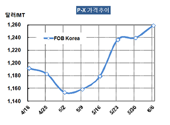 P-X 가격은 6월6일 FOB Korea 톤당 1259달러로 19달러 상승했다.