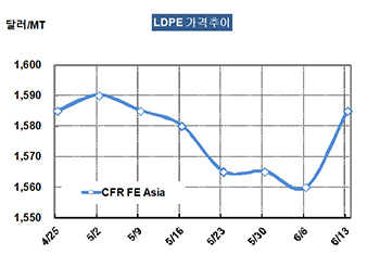 LDPE 가격은 6월11일 CFR FE Asia 톤당 1585달러로 25달러 급등했다.