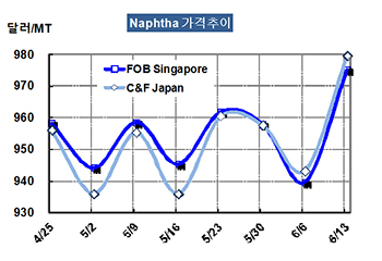 나프타 가격은 6월13일 CFR Japan 톤당 980달러로 37달러 급등했다. 이라크 반군이 북부에서 수도 바그다드 방향으로 진격하면서 이라크의 정정이 극히 불안정해지고 있기 때문으로, 국제유가가 어느 방향으로 흘러갈지 주목되고 있다. 표,그래프: <Naphtha 가격추이> <화학저널 2014/06/16> |