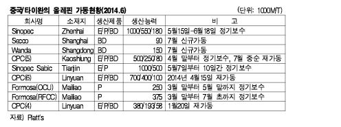 표,그래프: <중국/타이완의 올레핀 가동현황(2014.6)> <화학저널 2014/06/16> |