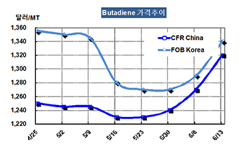 부타디엔 가격은 6월13일 FOB Korea 톤당 1340달러로 50달러 급등했다.