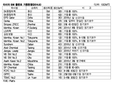 표,그래프: <아시아 SM 플랜트 가동현황(2014.6)> <화학저널 2014/06/18> |